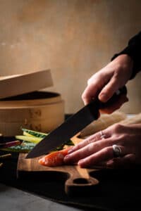 - Cut salmon, and cucumber to 1 cm (or 1/2 inch) thin strips