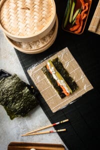Først og fremst: knekk nori-arkene i to, som om du skulle splittet en treplanke i karate! Som vanlig, legg nori-arket med den glatte siden ned og den ru siden opp. Fordel deretter den perfekt kokte sushirisen jevnt utover nori-arket. Når risen er jevnt fordelt, snur du arket, og så kan fyllingen begynne!